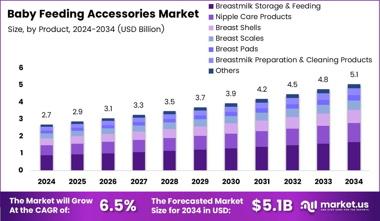 - Global Baby Feeding Accessories Market projected to reach USD 5.1 Billion by 2034 from USD 2.7 Billion in 2024.