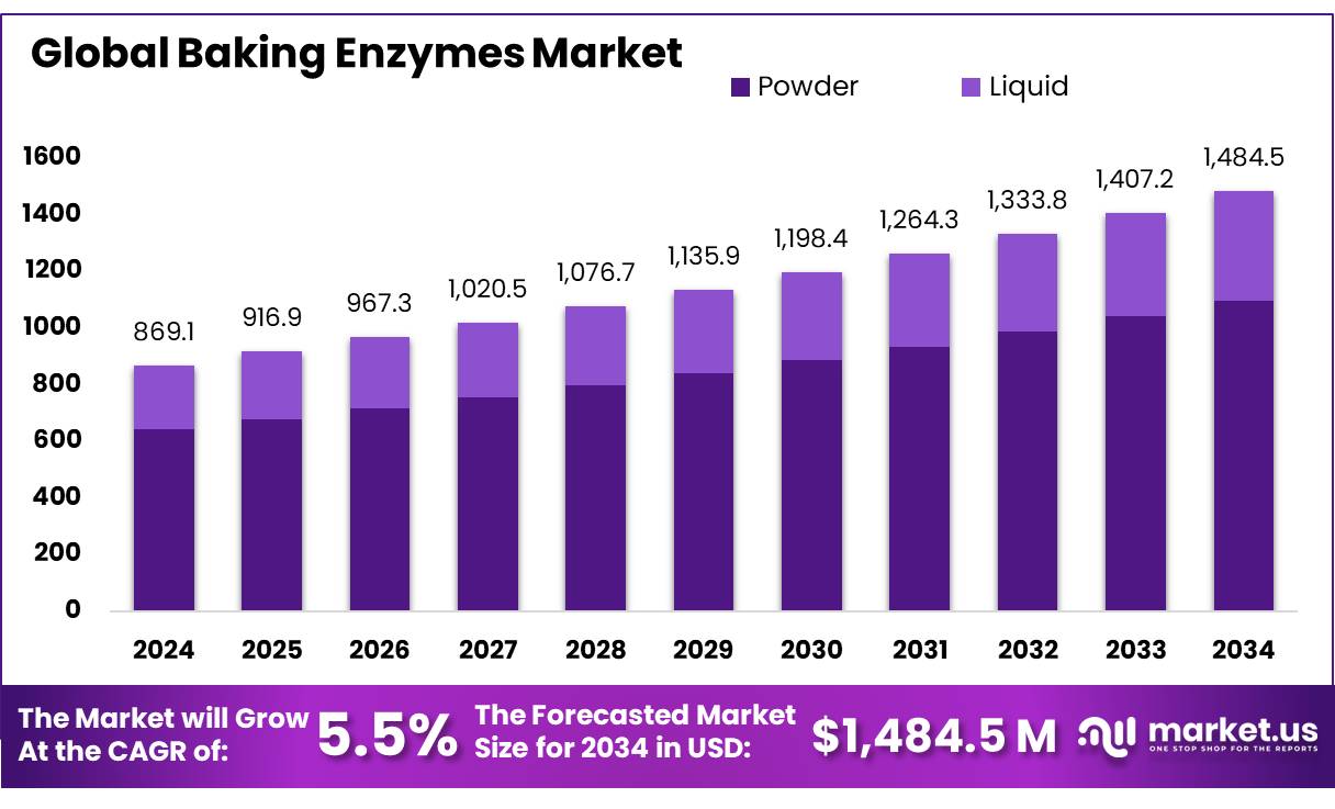 The Global Baking Enzymes Market size is expected to be worth around USD 1484.5 Mn by 2034, from USD 869.1 Mn in 2024, growing at a CAGR of 5.5% during the forecast period from 2025 to 2034.