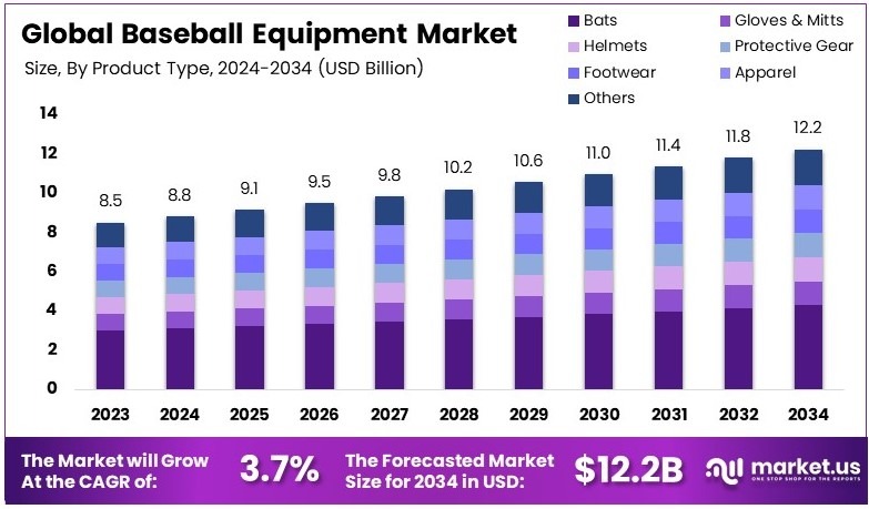 - The Baseball Equipment Market was valued at USD 8.5 Billion in 2024, and is expected to reach USD 12.2 Billion by 2034, with a CAGR of 3.7%.