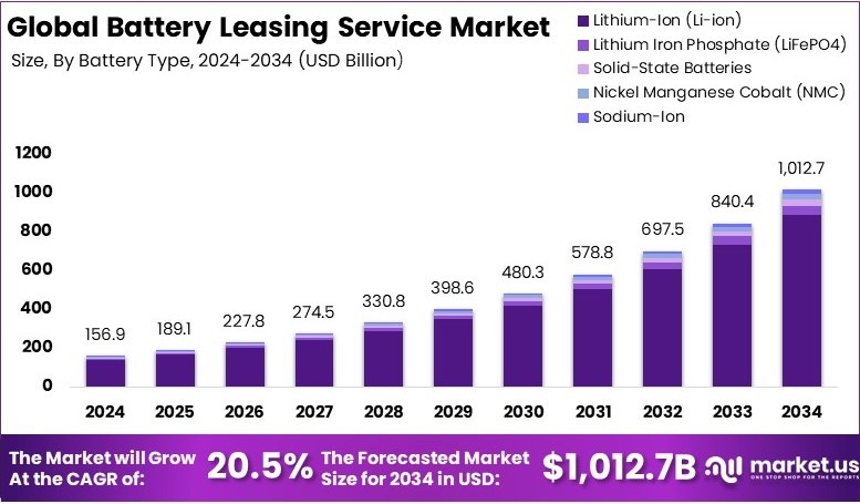 - The Battery Leasing Service Market was valued at USD 156.9 billion in 2024 and is expected to reach USD 1,012.7 billion by 2034, with a CAGR of 20.5%.