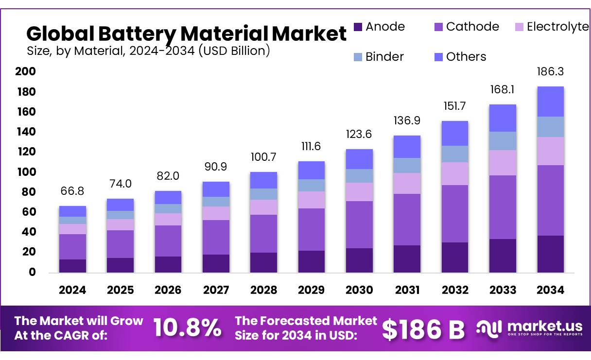 - Battery Material Market size is expected to be worth around USD 186.3 Bn by 2034, from USD 66.8 Bn in 2024, growing at a CAGR of 10.8%.