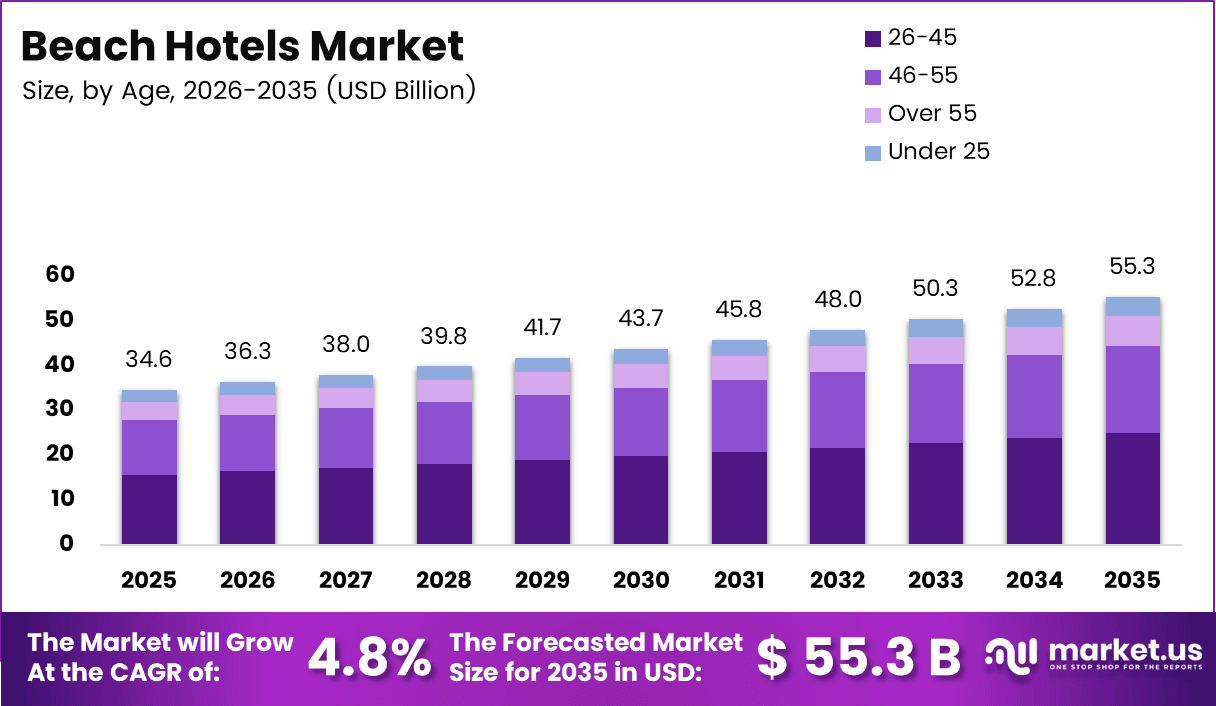 - The global Beach Hotels Market is projected to expand from USD 34.6 billion in 2025 to USD 55.3 billion by 2035, registering a CAGR of 4.8% during 2026–2035.