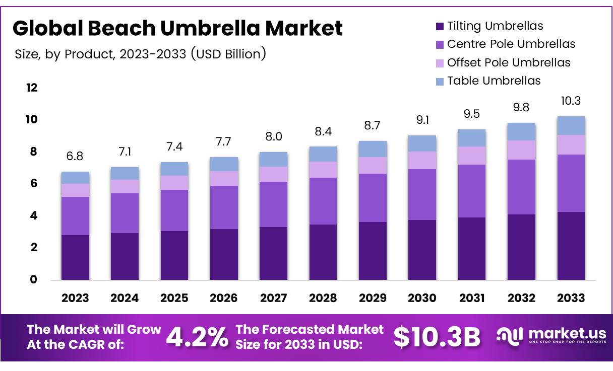 The Global Beach Umbrella Market size is expected to be worth around USD 10.3 Billion by 2033, from USD 6.8 Billion in 2023, growing at a CAGR of 4.2% during the forecast period from 2024 to 2033.