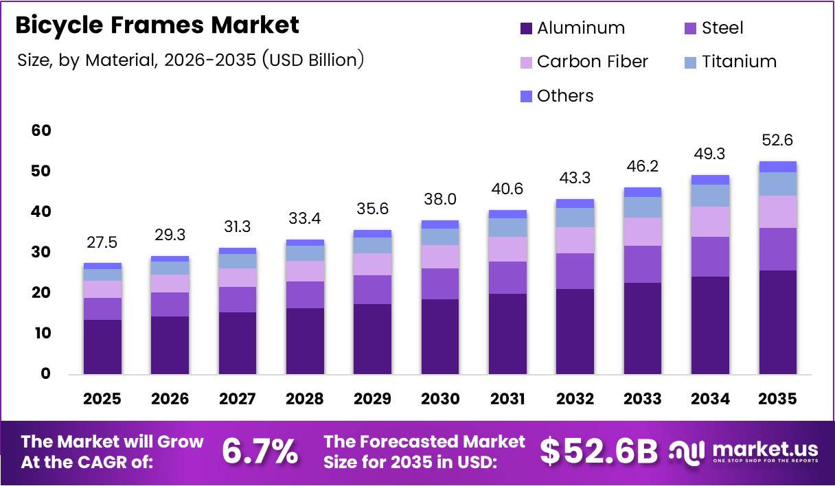 - Global Bicycle Frames Market projected to grow from USD 27.5 Billion in 2025 to USD 52.6 Billion by 2035 at 6.7% CAGR