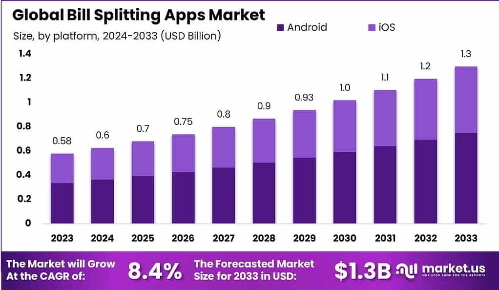 - The global bill-splitting apps market is showing promising growth, with its value expected to reach USD 1.3 billion by 2033, up from USD 0.58 billion in 2023. This growth represents a steady CAGR of 8.4% over the forecast period (2024–2033).