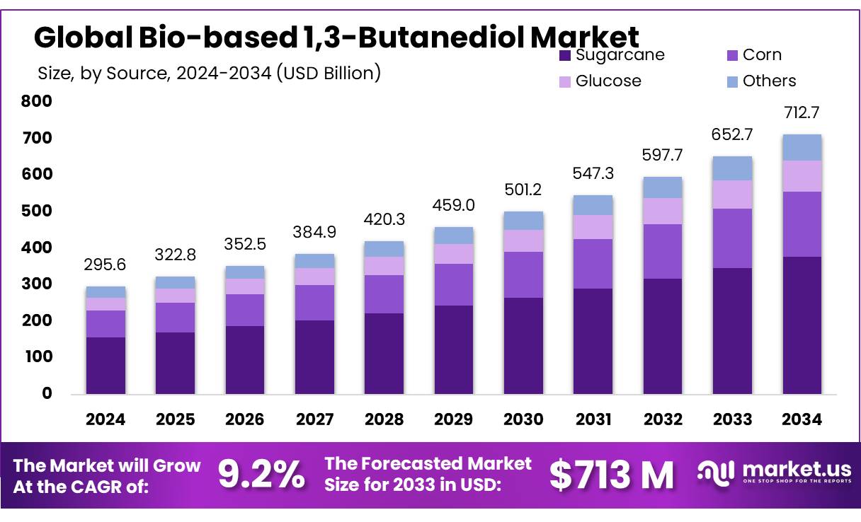 - Bio-based 1,3-Butanediol Market size is expected to be worth around USD 712.7 Mn by 2034, from USD 295.6 Mn in 2024, growing at a CAGR of 9.2%.