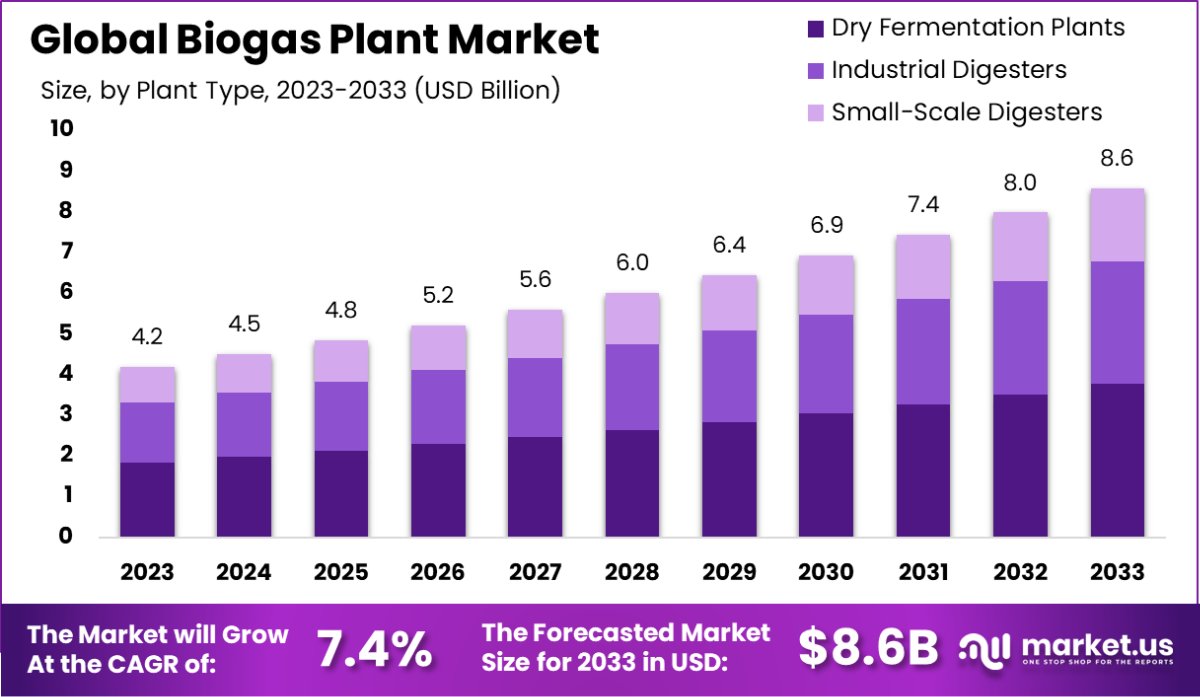 - The Global Biogas Plant Market is expected to be worth around USD 8.6 Billion by 2033, up from USD 4.2 Billion in 2023, and grow at a CAGR of 7.4% from 2024 to 2033.