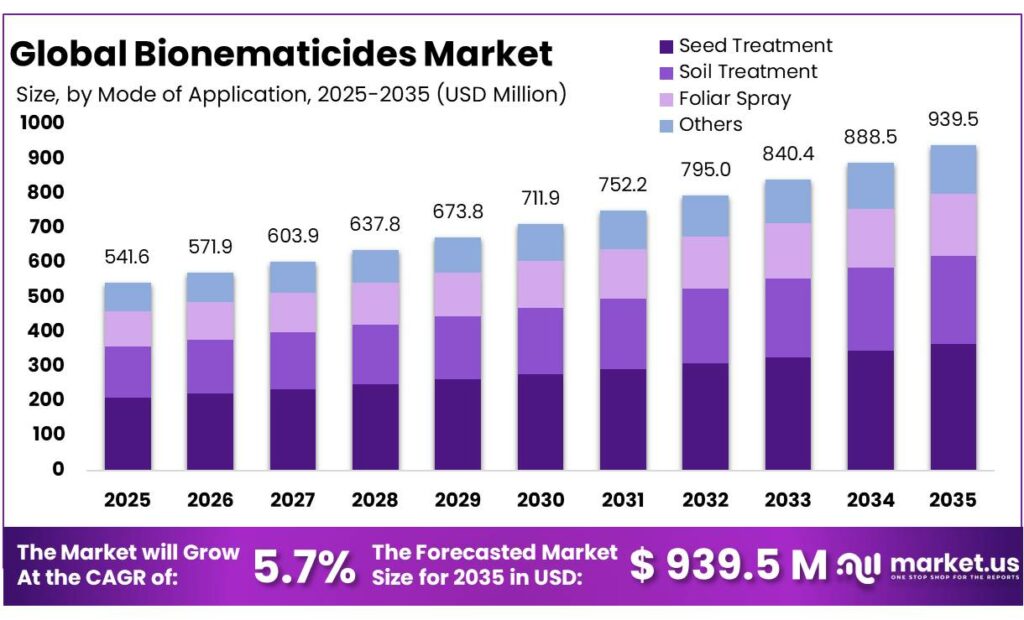 - Bionematicides Market size is expected to be worth around USD 939.5 Million by 2035, from USD 541.6 Million in 2025, growing at a CAGR of 5.7%.