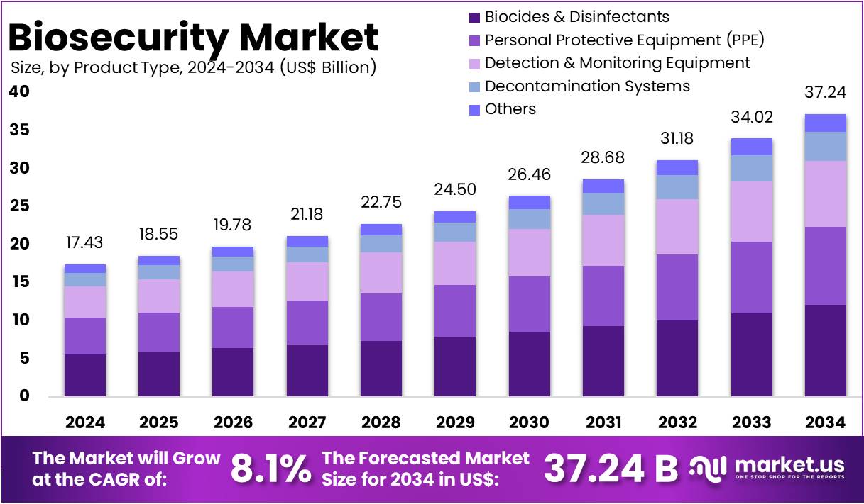 Biosecurity Market By Product Type (Biocides & Disinfectants, Personal Protective Equipment (PPE), Detection & Monitoring Equipment, Decontamination Systems, Others), By Application (Quarantine and Disease Surveillance, Bioterrorism and Biodefense, Lab Biosafety, Food Safety, Others), By End-User (Government & Regulatory Bodies, Healthcare Institutions, Agricultural Sector, Research & Academia, Private & Commercial Sectors), Region and Companies – Industry Segment Outlook, Market Assessment, Competition Scenario, Trends and Forecast 2025-2034