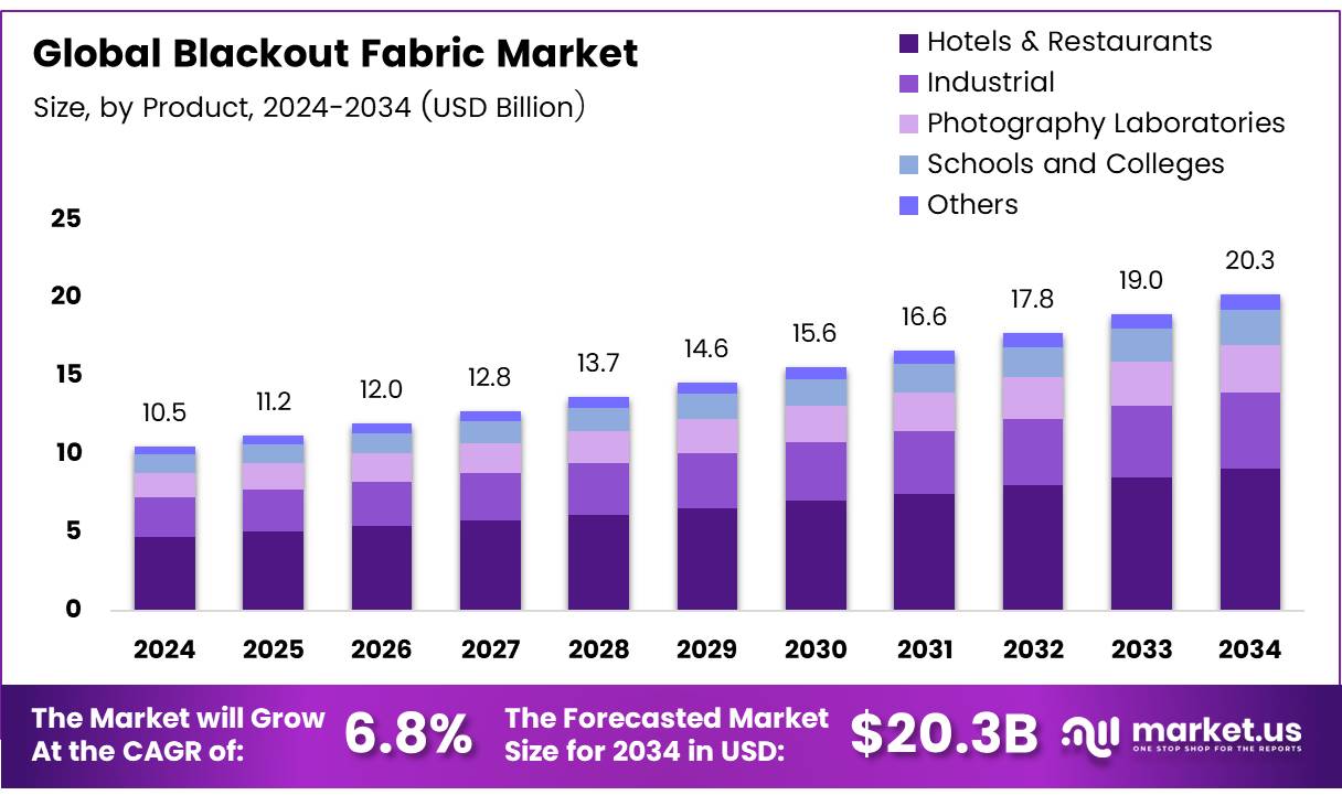 The Global Blackout Fabric Market size is expected to be worth around USD 20.3 Billion by 2034, from USD 10.5 Billion in 2024, growing at a CAGR of 6.8% during the forecast period from 2025 to 2034.