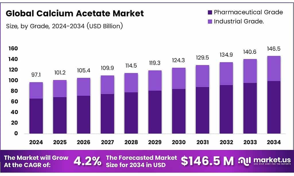 - The Global Calcium Acetate Market is projected to grow from USD 97.1 million in 2024 to USD 146.5 million by 2034, at a CAGR of 4.2%.