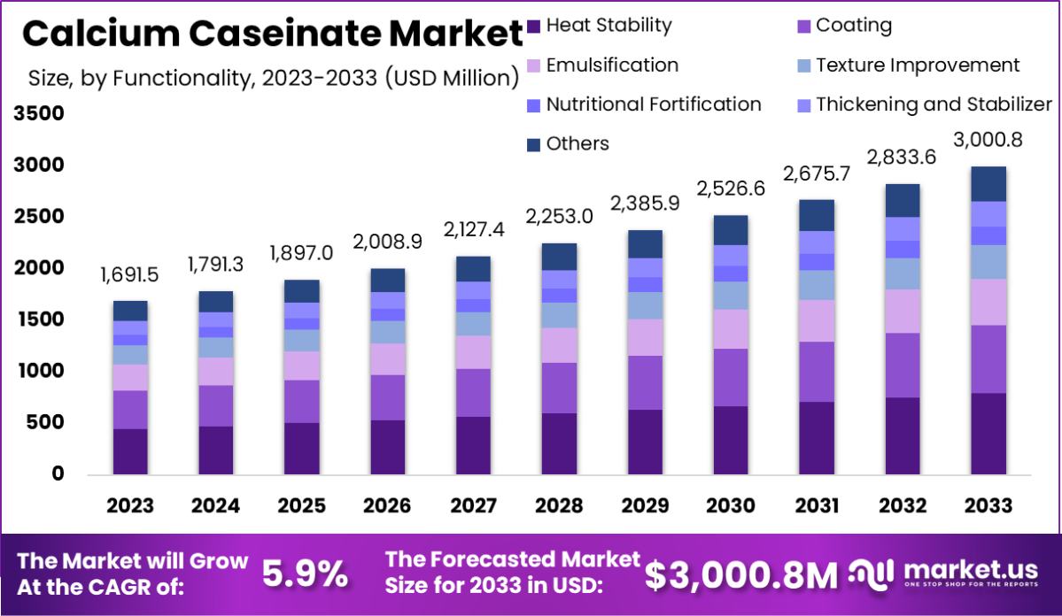 - The Global Calcium Caseinate Market is expected to be worth around USD 3,000.8 Million by 2033, up from USD 1691.5 Million in 2023, and grow at a CAGR of 5.9% from 2024 to 2033.