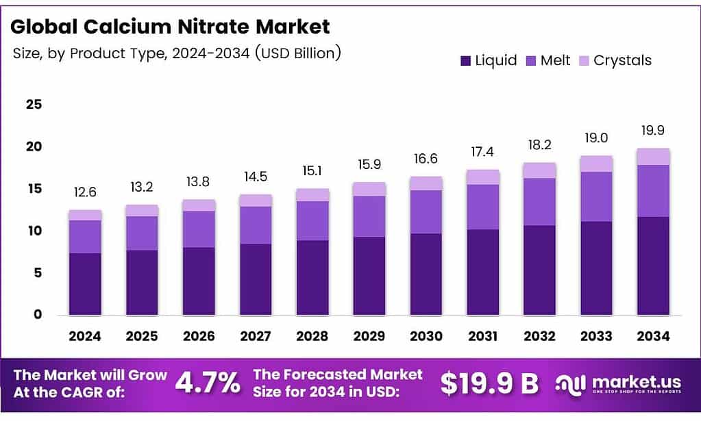 - The Global Calcium Nitrate Market is valued at USD 12.6 billion in 2024 and is projected to reach USD 19.9 billion by 2034, at a CAGR of 4.7% between 2025 and 2034.