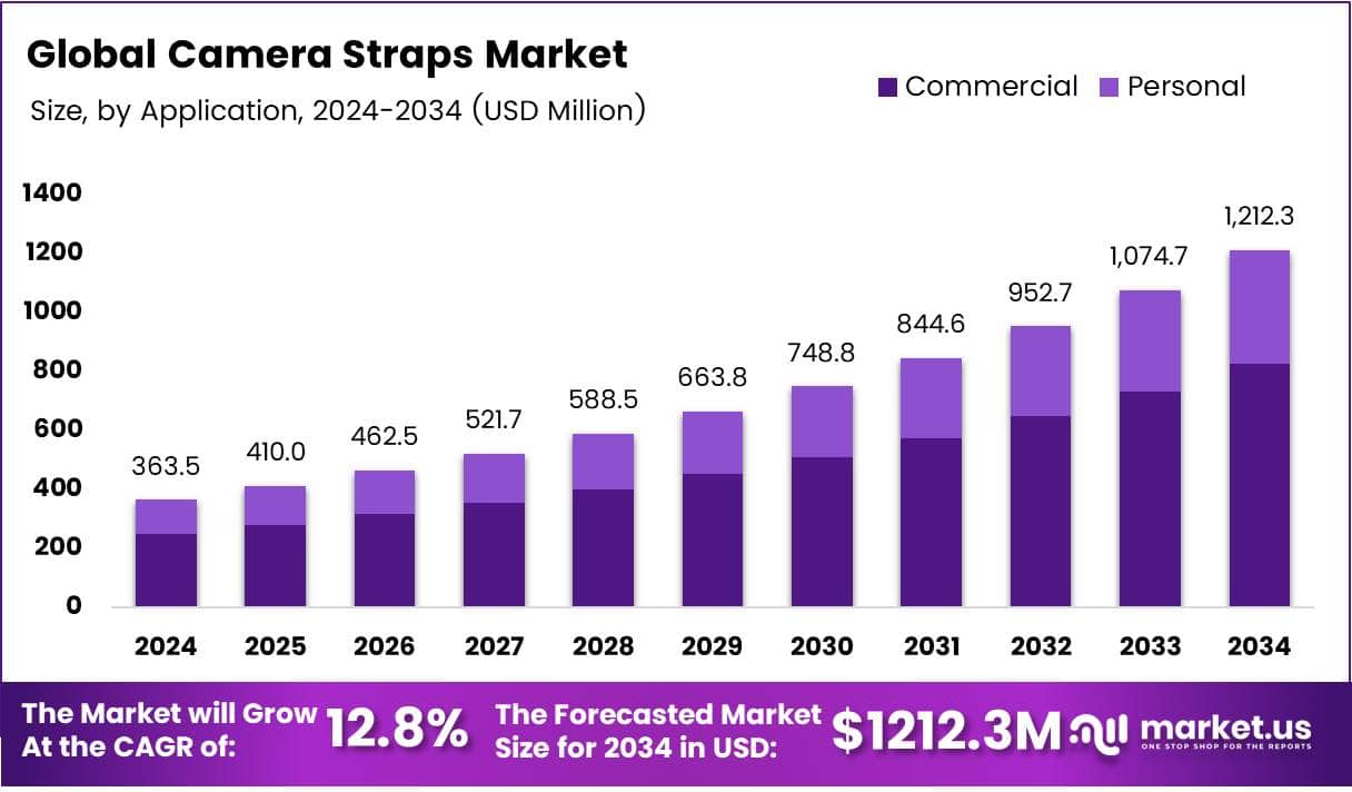 The Global Camera Straps Market size is expected to be worth around USD 1212.3 Million by 2034, from USD 363.5 Million in 2024, growing at a CAGR of 12.8% during the forecast period from 2025 to 2034.