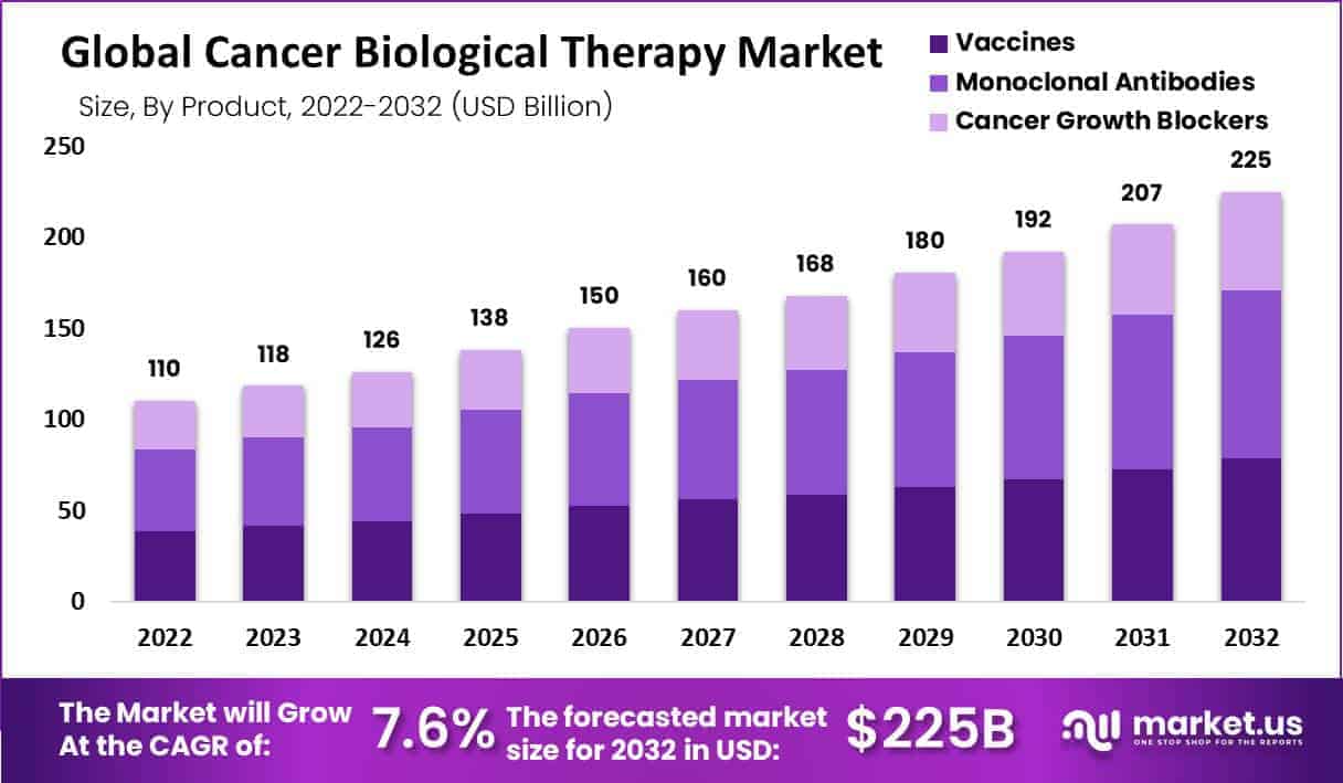 How much is the Cancer Biological Therapy Market worth?Global market size is worth USD 225 Billion by 2032.