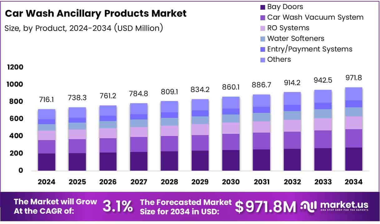 - Global Car Wash Ancillary Products Market is projected to reach USD 971.8 Million by 2034, up from USD 716.1 Million in 2024.