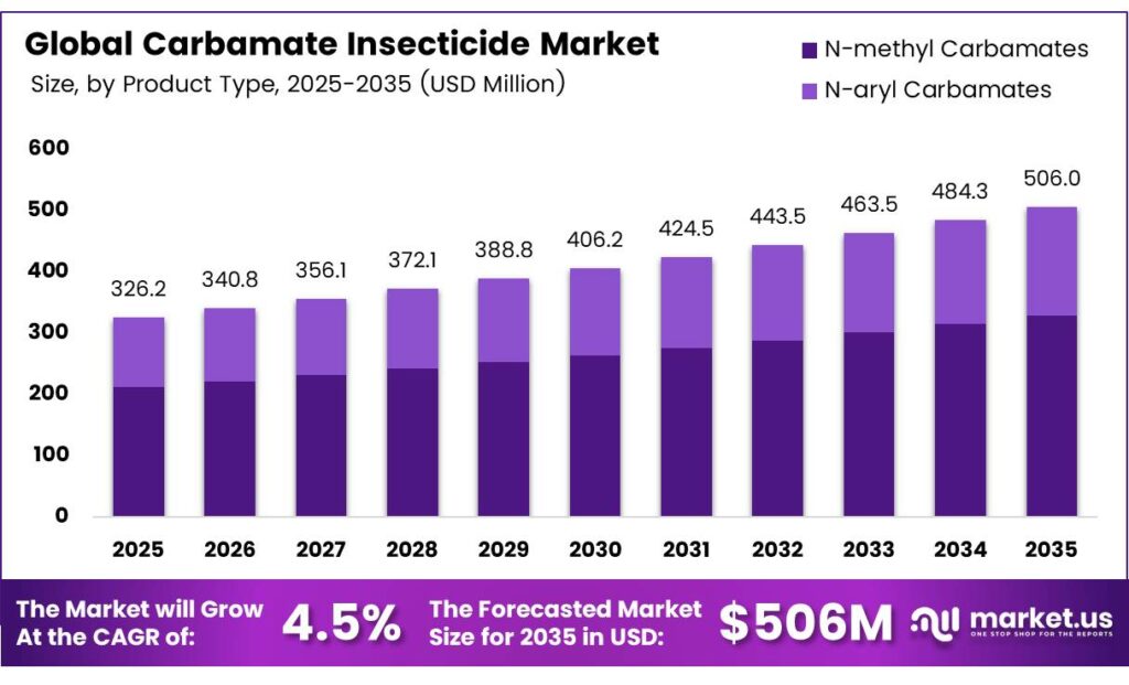 The Global Carbamate Insecticide Market size is expected to be worth around USD 506.0 million by 2035 from USD 326.1 million in 2025, growing at a CAGR of 4.5% during the forecast period 2026 to 2035.