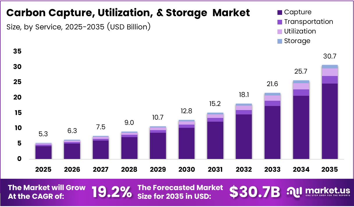 Global Carbon Capture, Utilization, and Storage (CCUS) Market size is expected to be worth around USD 30.7 Billion by 2035 from USD 5.30 Billion in 2025, growing at a CAGR of 19.20% during the forecast period 2026 to 2035.