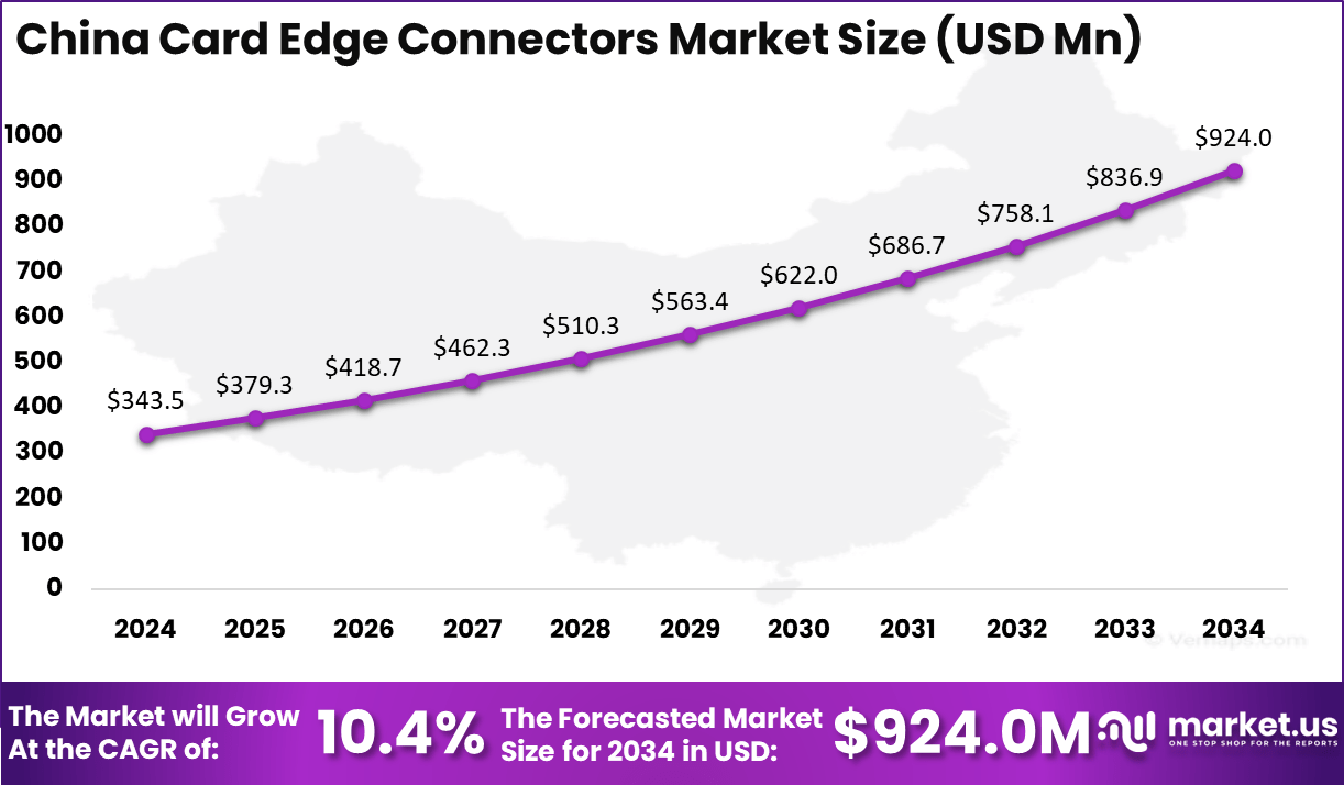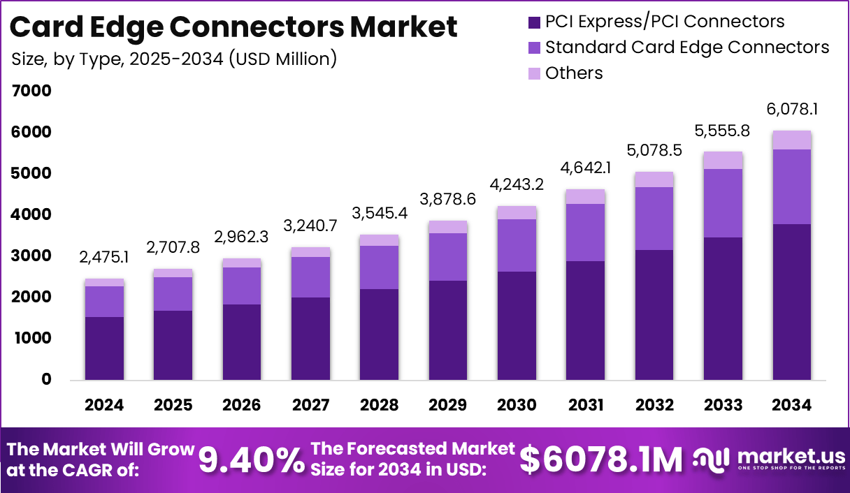 - Market Growth: The Card Edge Connectors Market is projected to grow from USD 2,475.1 million in 2024 to USD 6,078.1 million by 2034, registering a CAGR of 9.40%.