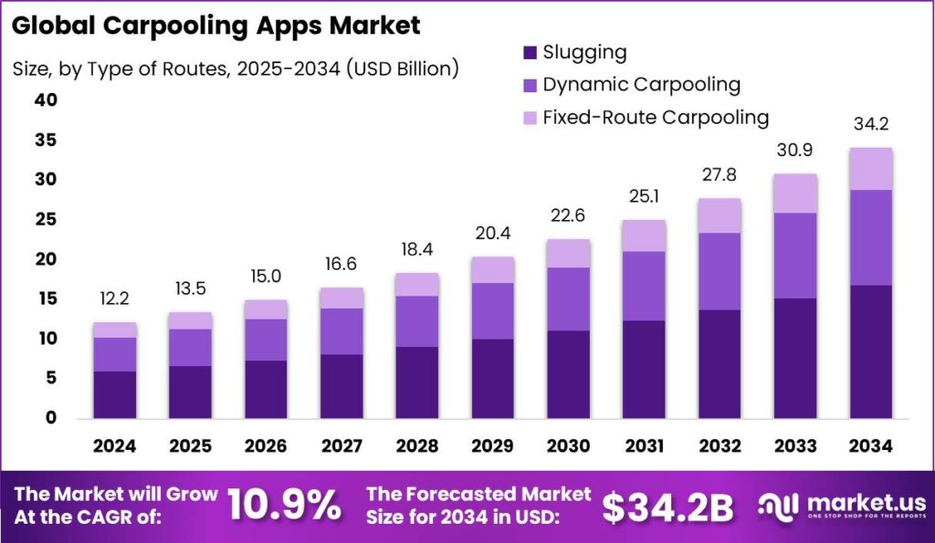 - The Global Carpooling Apps Market size is expected to reach USD 34.2 Billion by 2034, up from USD 12.17 Billion in 2024, growing at a CAGR of 10.90% during the forecast period from 2025 to 2034.