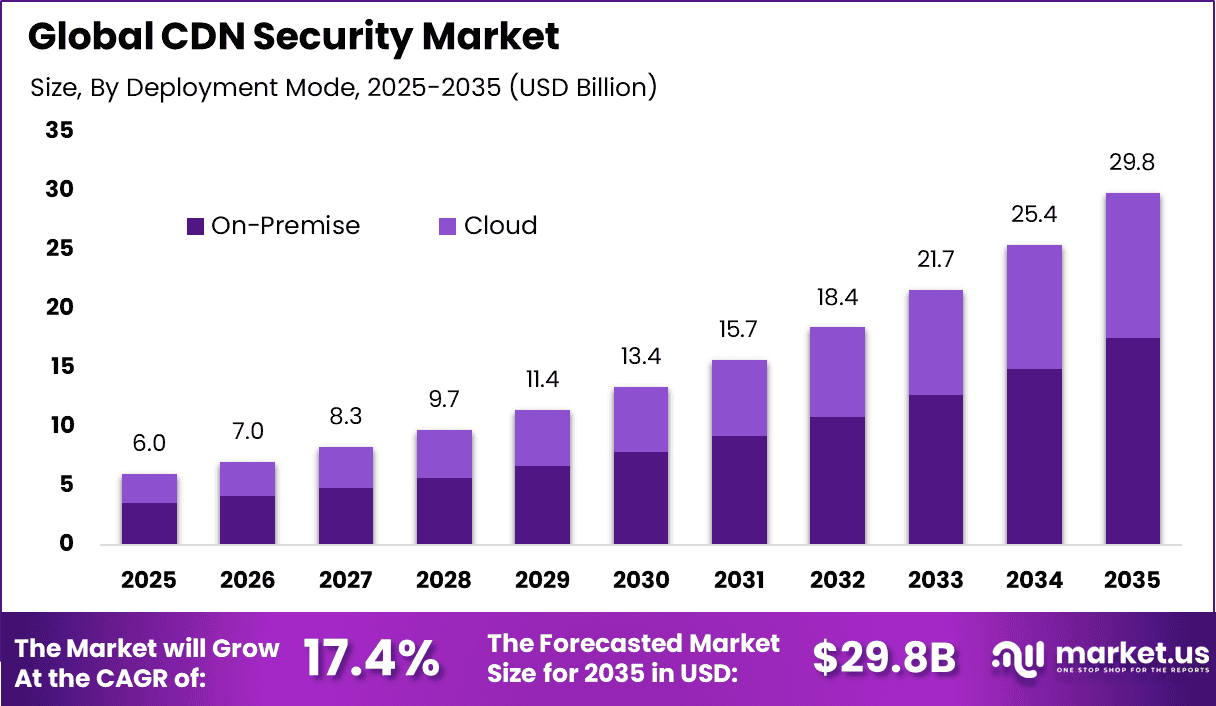 Report Features Description Market Value (2025) USD 6.0 Bn Forecast Revenue (2035) USD 29.8 Bn CAGR(2026-2035) 17.4% Base Year for Estimation 2025 Historic Period 2020-2024 Forecast Period 2026-2035 Report Coverage Revenue forecast, AI impact on Market trends, Share Insights, Company ranking, competitive landscape, Recent Developments, Market Dynamics and Emerging Trends Segments Covered By Organization Size (Small and Medium-Sized Businesses (SMBs), Large Enterprises), By Security Type (DDoS Protection, Web Application Firewall (WAF), Bot Mitigation and Screen-Scraping Protection, Data Security and Content Integrity, Others), By End-user Industry (Media and Entertainment, Retail and E-commerce, BFSI, IT and Telecom, Healthcare and Life Sciences, Government and Public Sector, Education, Others), By Deployment Mode (Cloud, On-Premise) Regional Analysis North America – US, Canada; Europe – Germany, France, The UK, Spain, Italy, Russia, Netherlands, Rest of Europe; Asia Pacific – China, Japan, South Korea, India, New Zealand, Singapore, Thailand, Vietnam, Rest of Latin America; Latin America – Brazil, Mexico, Rest of Latin America; Middle East & Africa – South Africa, Saudi Arabia, UAE, Rest of MEA Competitive Landscape Akamai Technologies Inc., Amazon Web Services Inc. (CloudFront), Cloudflare Inc., Google LLC (Cloud CDN), Microsoft Corp. (Azure Front Door), Imperva Inc., Fastly Inc., Edgio Inc. (Limelight Networks), Verizon Media Platform, Radware Ltd., F5 Inc., StackPath LLC, G-Core Labs S.A., Alibaba Cloud (Alibaba Group), Corero Network Security plc, Nexusguard Ltd., CDNetworks Inc., Neustar Security Services, Akamai (Prolexic), NETSCOUT Systems (Arbor), Others Customization Scope Customization for segments, region/country-level will be provided. Moreover, additional customization can be done based on the requirements. Purchase Options We have three license to opt for: Single User License, Multi-User License (Up to 5 Users), Corporate Use License (Unlimited User and Printable PDF)