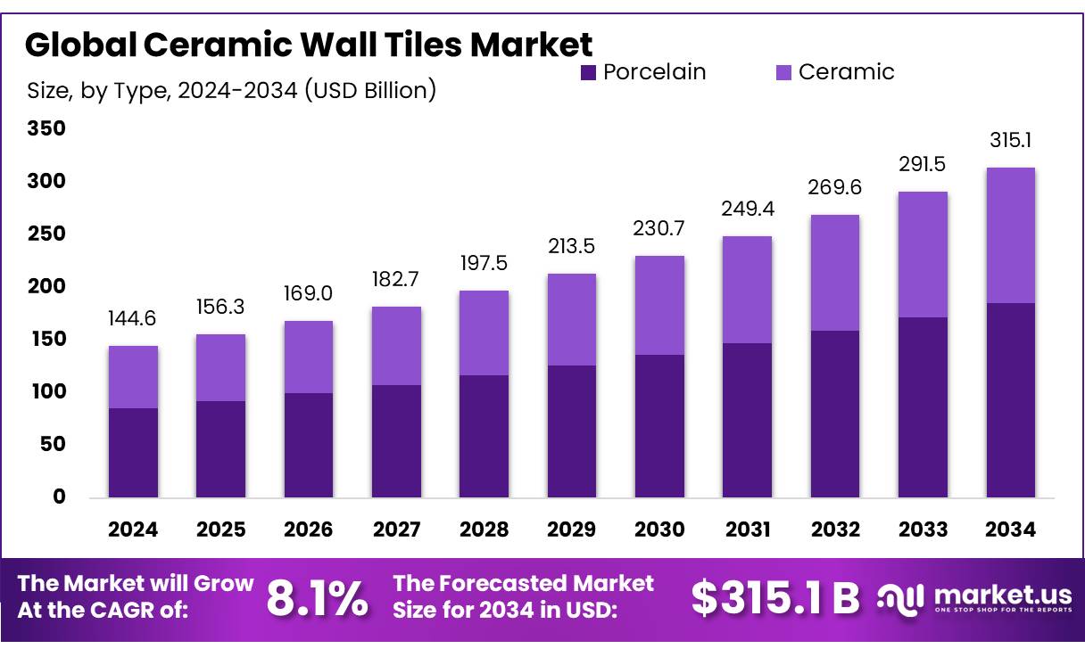 - The Global Ceramic Wall Tiles Market is projected to reach USD 315.1 billion by 2034, growing at a CAGR of 8.1% from 2025 to 2034.