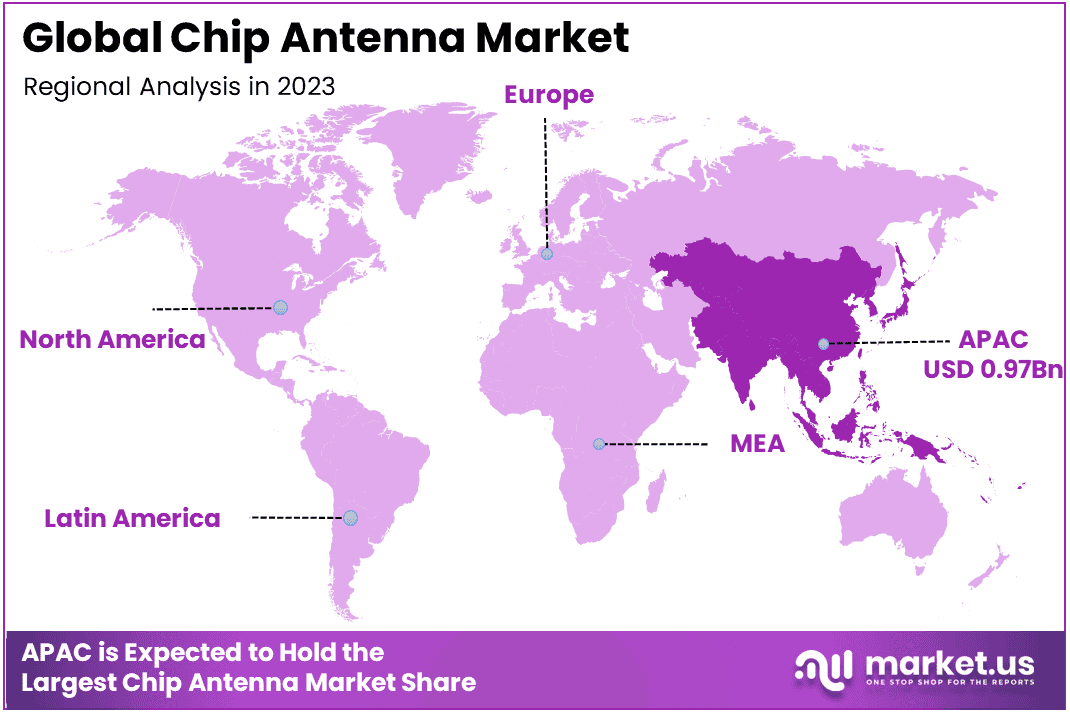 In 2023, the Asia Pacific (APAC) region held a dominant market position in the chip antenna market, capturing more than a 37.5% share By 0.97 Billion. Asia Pacific’s dominance in the chip antenna market is driven by several factors, including its ongoing adoption of advanced technologies like 5G and IoT, which fuels demand for high-performance antennas. The region has growing tech companies and leading manufacturers who invest heavily in R&D, driving innovation in antenna design.