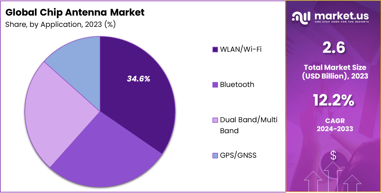 - In 2023, the WLAN/Wi-Fi segment held a dominant market position, capturing more than a 34.6% share of the chip antenna market.