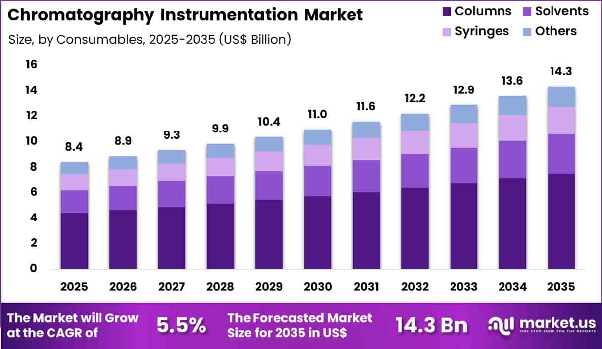 Columns generated 52.3% of growth within consumables and emerged as the leading segment due to their central role in chromatographic separation. Each analytical method requires specific column chemistry, which drives recurring replacement demand.