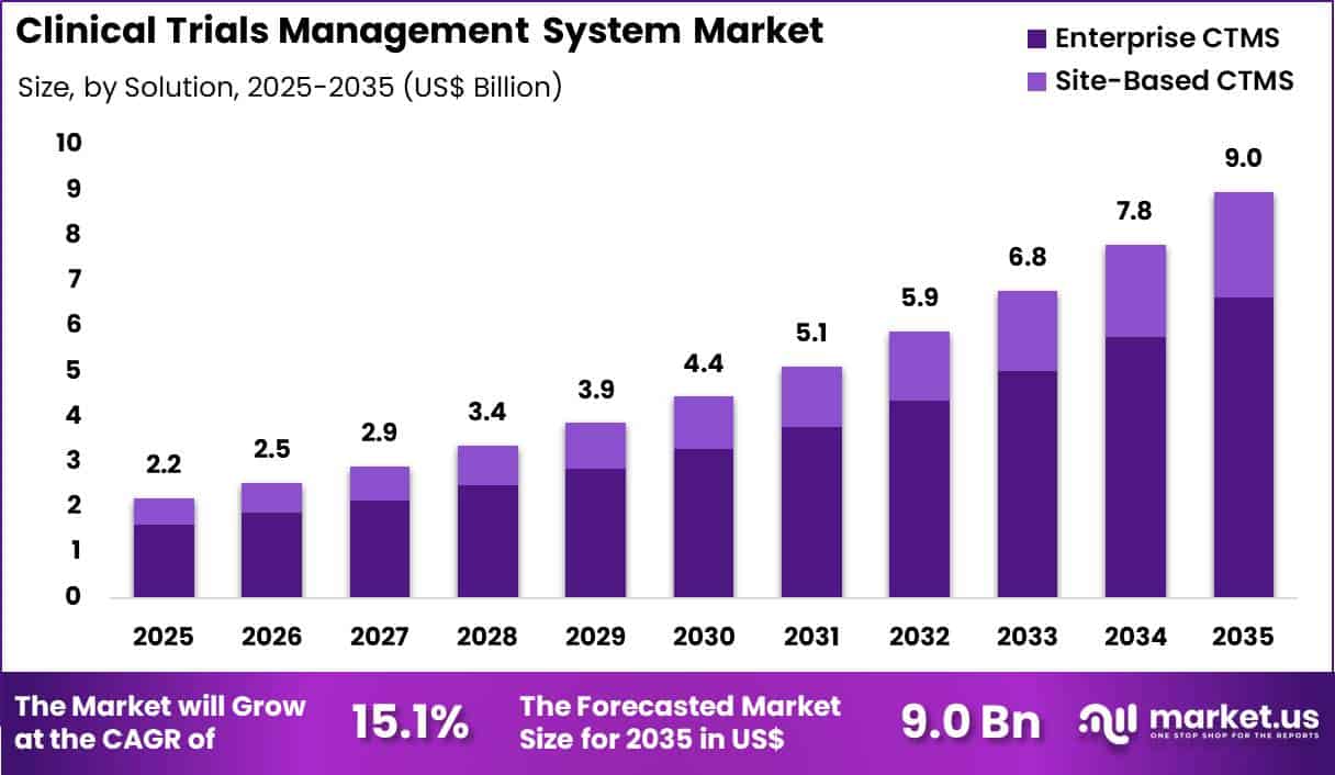 Enterprise CTMS accounted for 74.0% of growth within solution and dominated the clinical trials management system market due to the need for centralized oversight across multi-country trials. Large sponsors manage complex study portfolios that require integrated budgeting, site monitoring, and regulatory tracking.