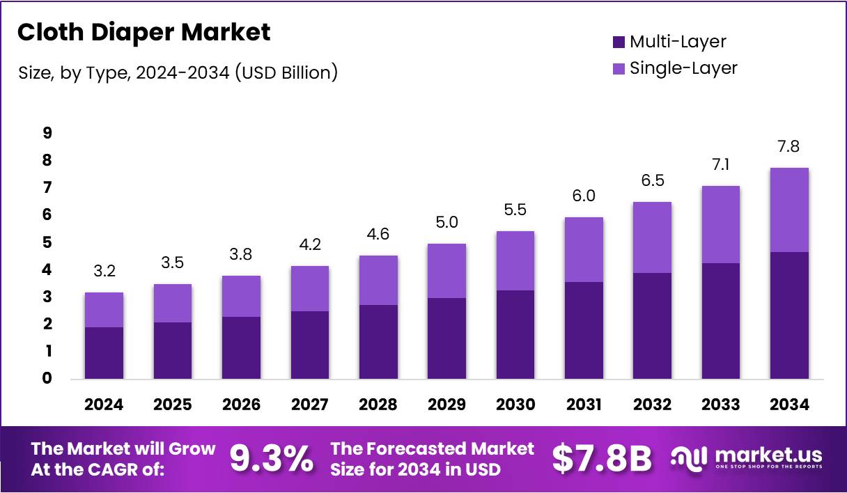 The Global Cloth Diaper Market size is expected to be worth around USD 7.8 Billion by 2034, from USD 3.2 Billion in 2024, growing at a CAGR of 9.3% during the forecast period from 2025 to 2034.