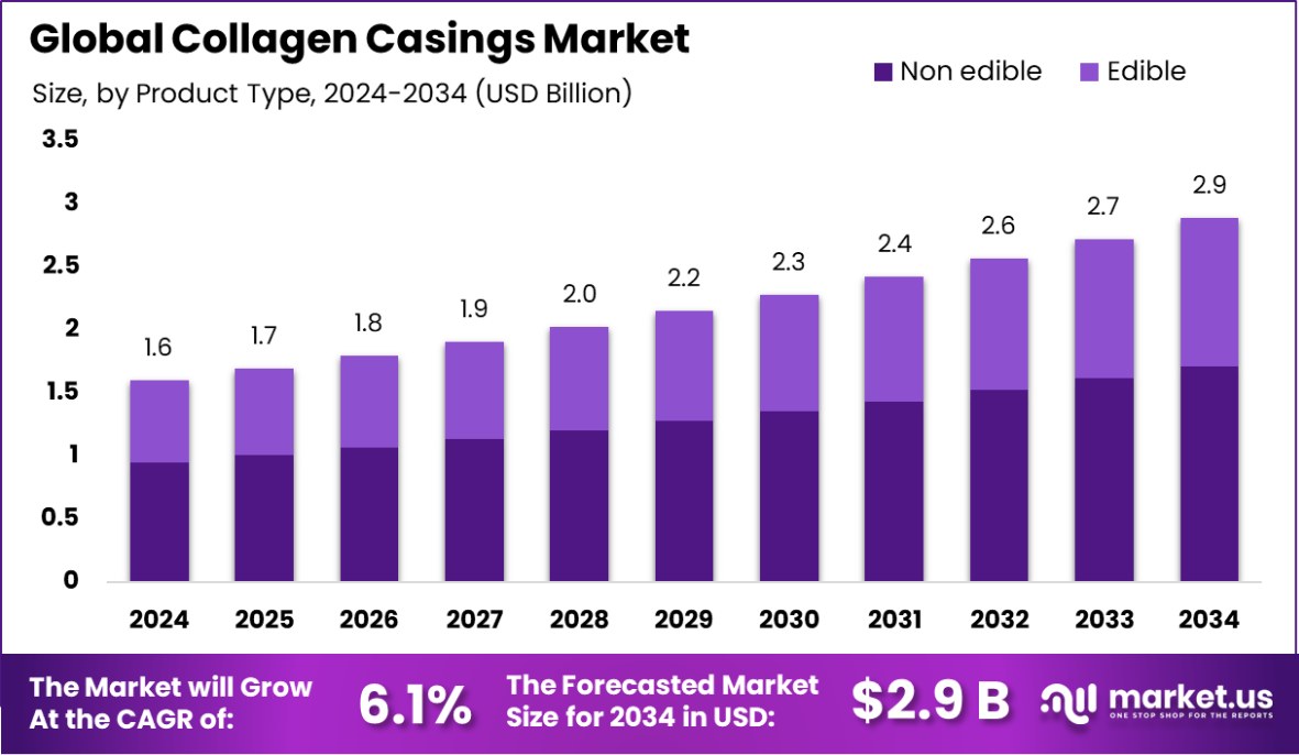 - Global Collagen Casings Market is expected to be worth around USD 2.9 Billion by 2034, up from USD 1.6 Billion in 2024, and grow at a CAGR of 6.1% from 2025 to 2034.
