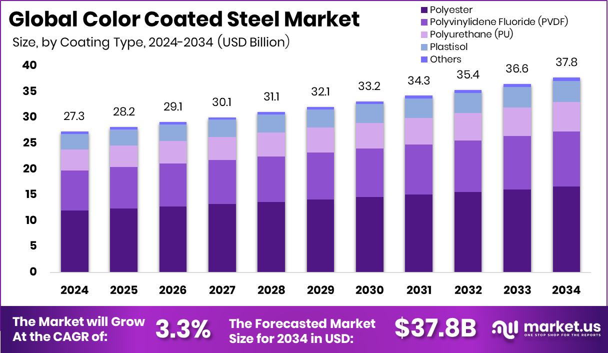 - The Global Color Coated Steel Market is expected to be worth around USD 37.8 billion by 2034, up from USD 27.3 billion in 2024, and grow at a CAGR of 3.3% from 2025 to 2034.