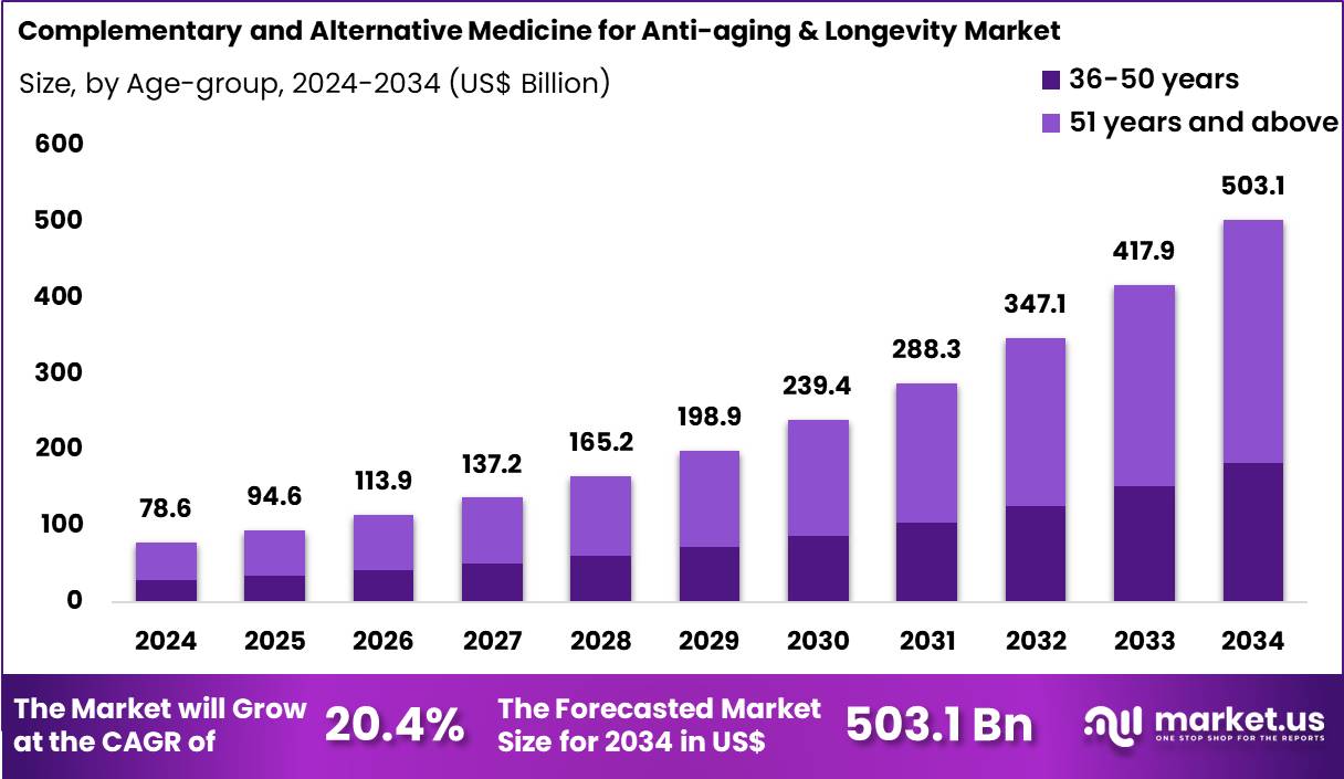The complementary and alternative medicine for anti-aging and longevity market is propelled by the rapidly expanding global population of older adults, who increasingly seek non-conventional therapies to promote healthy aging and extend lifespan.
