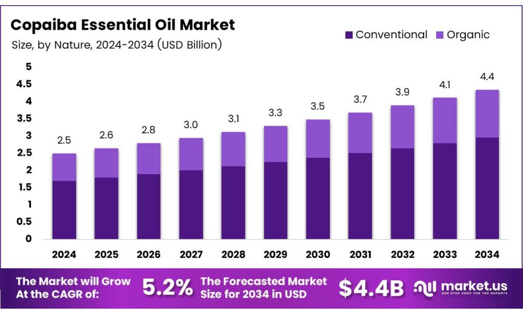 - The Global Copaiba Essential Oil Market is projected to grow from USD 2.5 billion in 2024 to USD 4.4 billion by 2034 at a 5.2% CAGR.