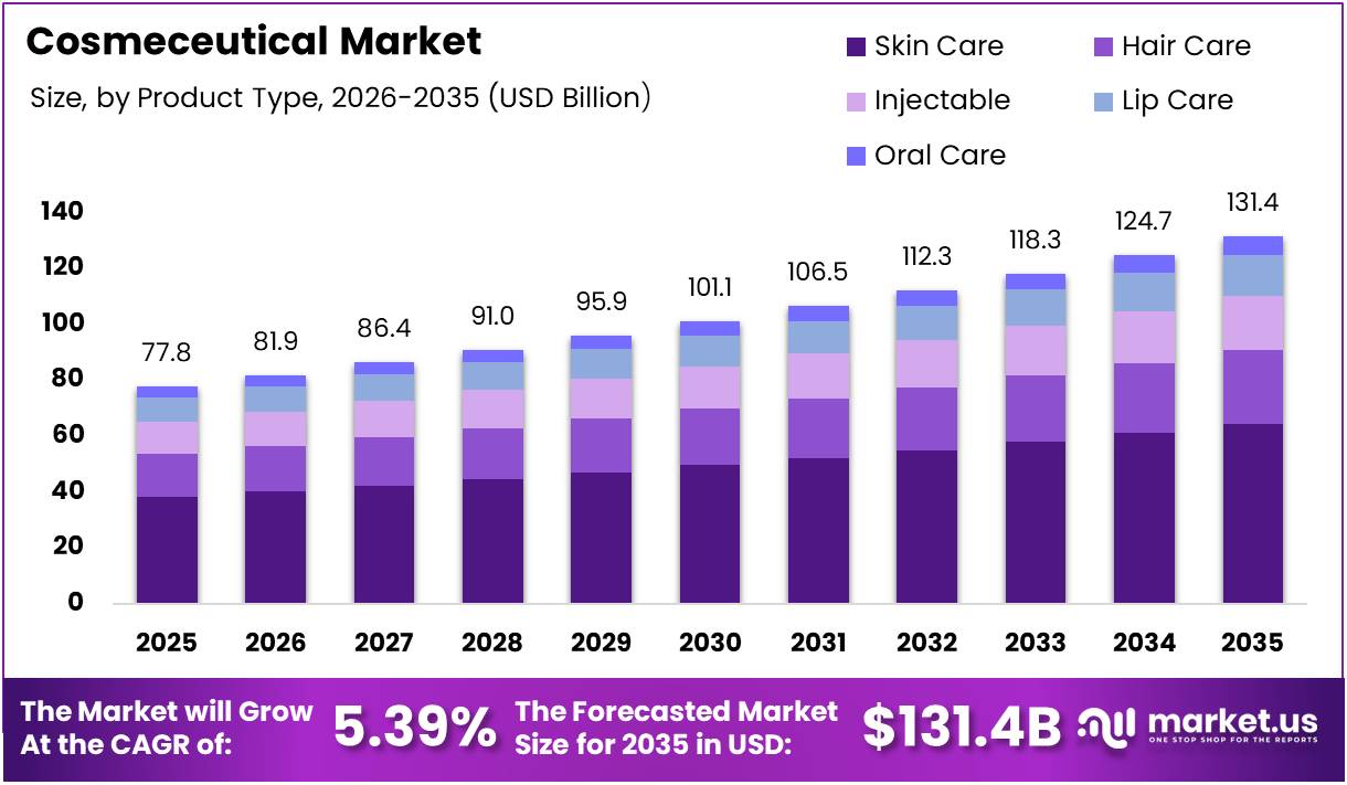 - Global Cosmeceutical Market valued at USD 77.75 Billion in 2025, projected to reach USD 131.4 Billion by 2035 at 5.39% CAGR