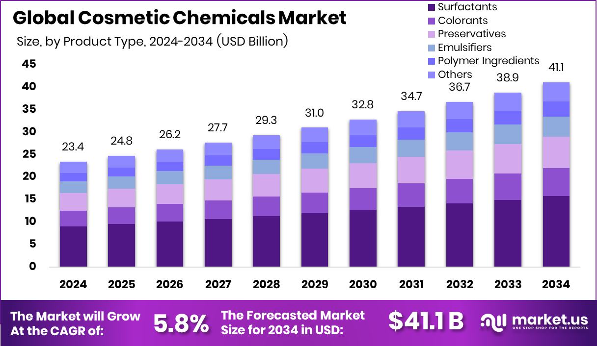 - The Global Cosmetic Chemicals Market is expected to be worth around USD 41.1 billion by 2034, up from USD 23.4 billion in 2024, and grow at a CAGR of 5.8% from 2025 to 2034.