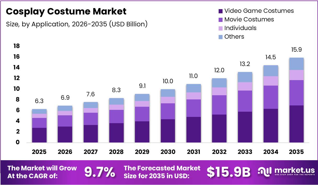 The Global Cosplay Costume Market size is expected to be worth around USD 15.9 Billion by 2035, from USD 6.3 Billion in 2025, growing at a CAGR of 9.7% during the forecast period from 2026 to 2035.