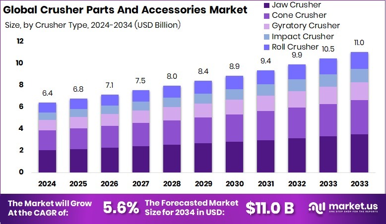- The Global Crusher Parts and Accessories Market is expected to be worth around USD 11.0 billion by 2034, up from USD 6.4 billion in 2024, and is projected to grow at a CAGR of 5.6% from 2025 to 2034.