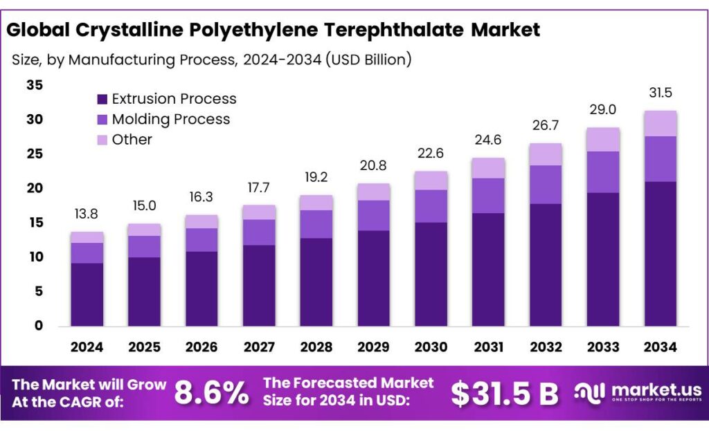 - Crystalline Polyethylene Terephthalate Market size is expected to be worth around USD 31.5 Billion by 2034, from USD 13.8 Billion in 2024, growing at a CAGR of 8.6%.