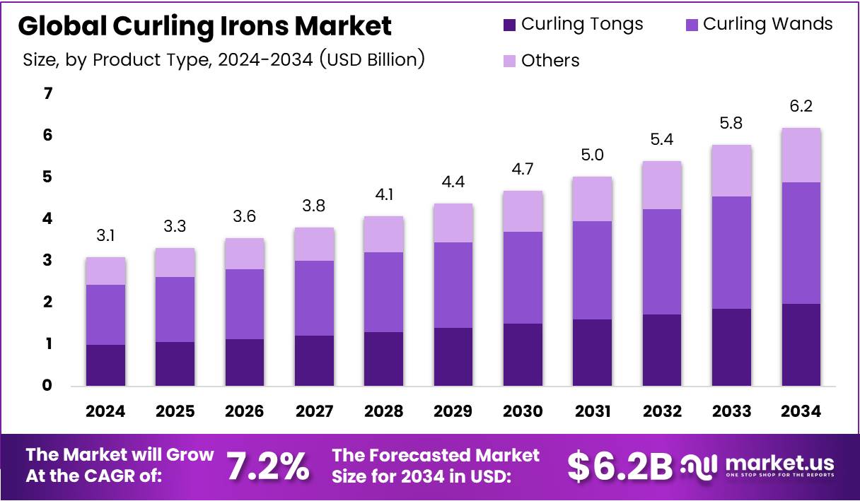 The Global Curling Irons Market size is expected to be worth around USD 6.2 Billion by 2034, from USD 3.1 Billion in 2024, growing at a CAGR of 7.2% during the forecast period from 2025 to 2034.