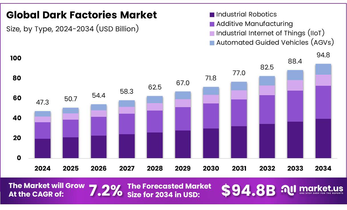 - The global Dark Factories Market is projected to double from USD 47.3 Billion in 2024 to USD 94.8 Billion by 2034, with a CAGR of 7.2%.