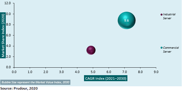 In terms of application, the commercial server segment accounted for the majority revenue shares of the global data center server market in 2020, and is projected to index the highest CAGR of 13%, with an attractiveness index of 9.6, over the forecast period. The industrial server segment accounted for a considerable number of revenue shares in 2020, and is expected to continue to do so in the coming years.