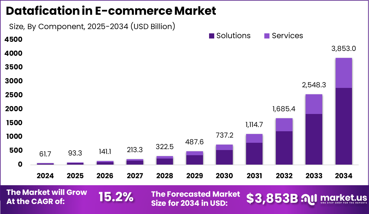 - The Global Datafication in E-commerce Market is set to grow from USD 61.7 Billion in 2024 to nearly USD 3,853 Billion by 2034, expanding at a strong CAGR of 15.2% over the forecast period.