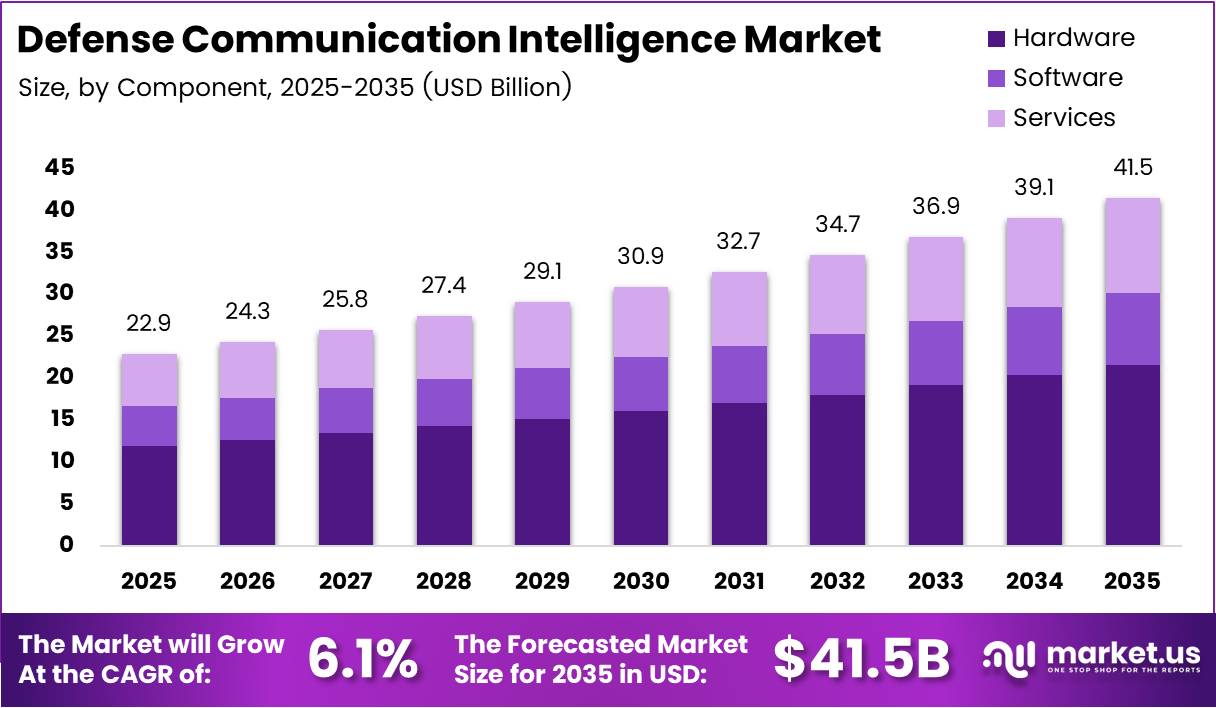 - The Global Defense Communication Intelligence Market was valued at USD 22.9 Billion in 2025 and is forecast to reach USD 41.5 Billion by 2035, at a CAGR of 6.1%.