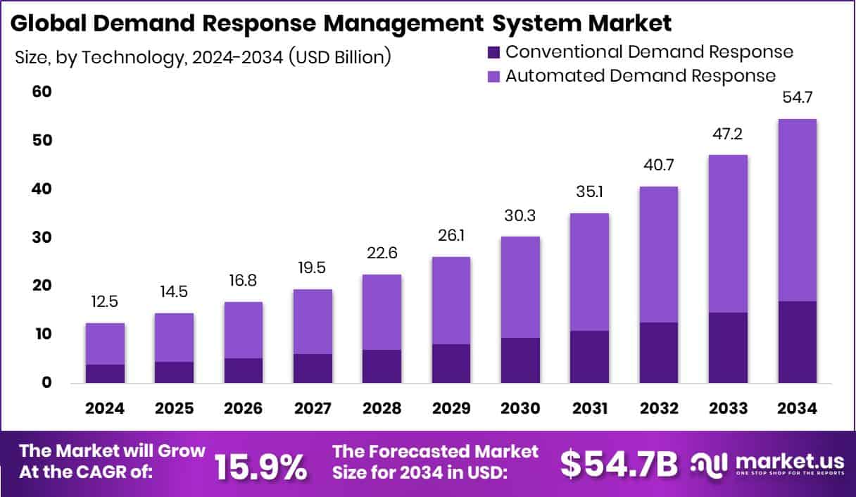 - The Global Demand Response Management System Market is expected to be worth around USD 54.7 billion by 2034, up from USD 12.5 billion in 2024, and is projected to grow at a CAGR of 15.9% from 2025 to 2034.