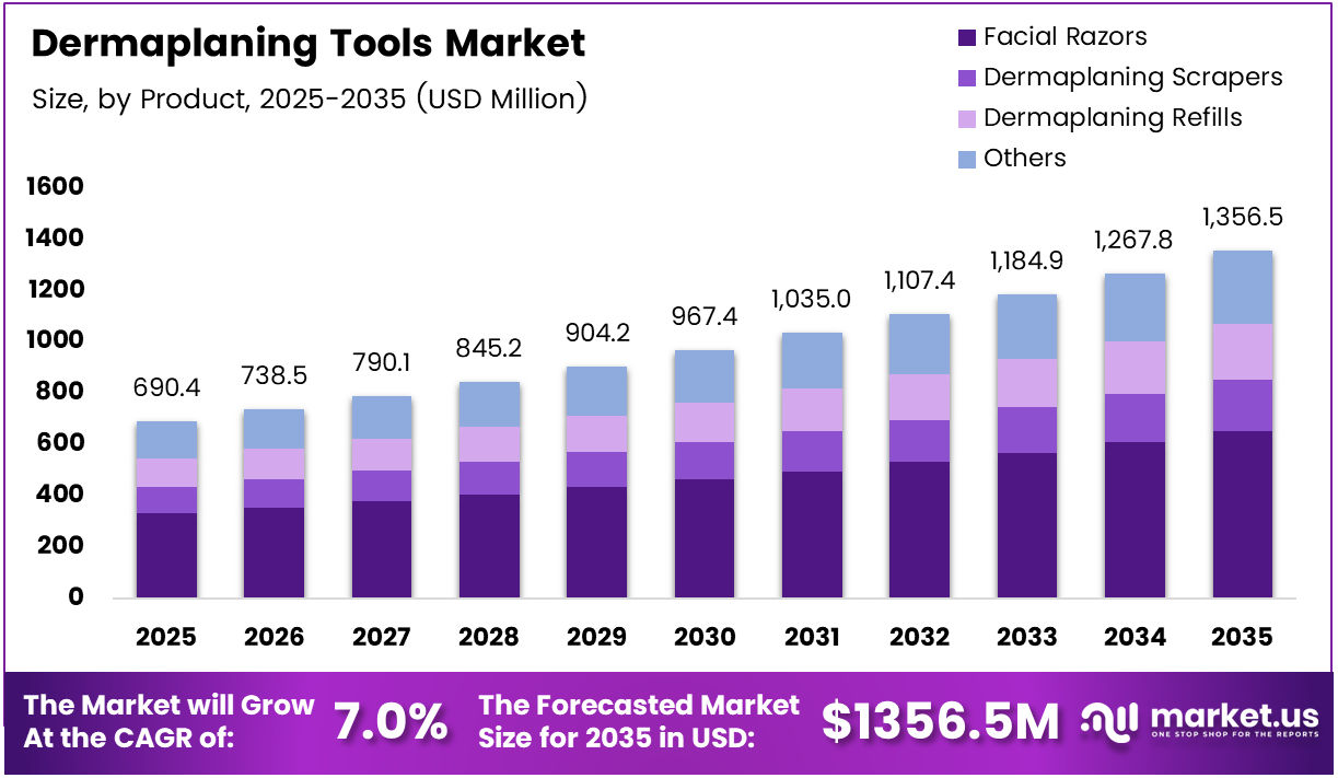 Global Dermaplaning Tools Market size is expected to be worth around USD 1,356.5 Million by 2035 from USD 690.4 Million in 2025, growing at a CAGR of 7.0% during the forecast period 2026 to 2035.