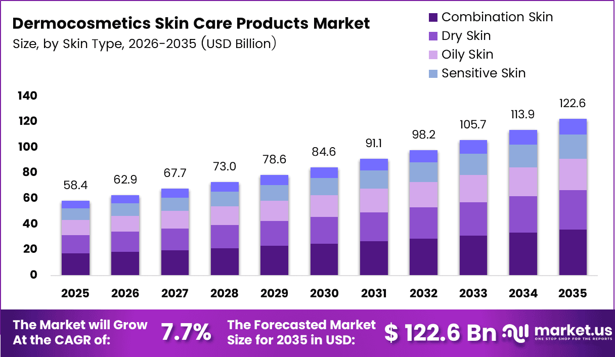 Global Dermocosmetics Skin Care Products Market size is expected to be worth around USD 122.6 Billion by 2035 from USD 58.4 Billion in 2025, growing at a CAGR of 7.7% during the forecast period 2026 to 2035.
