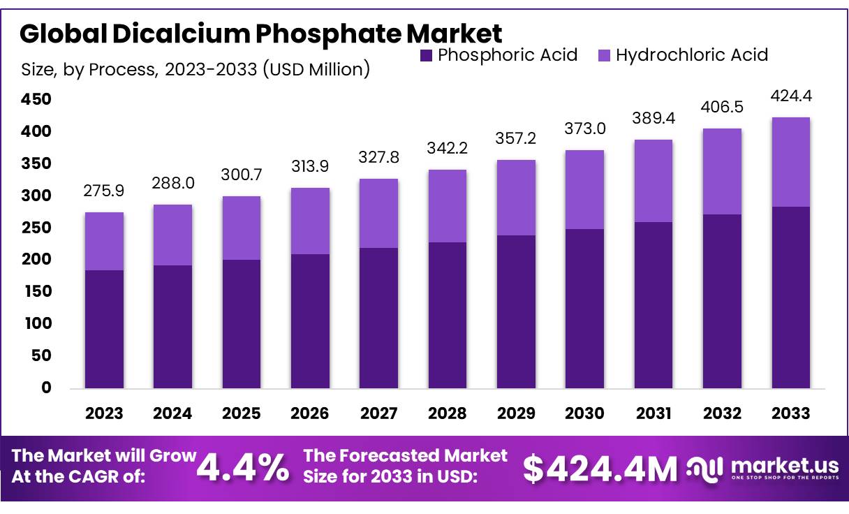 - Dicalcium phosphate Market size is expected to be worth around USD 424.4 Mn by 2033, from USD 275.9 Mn in 2023, growing at a CAGR of 4.4%.