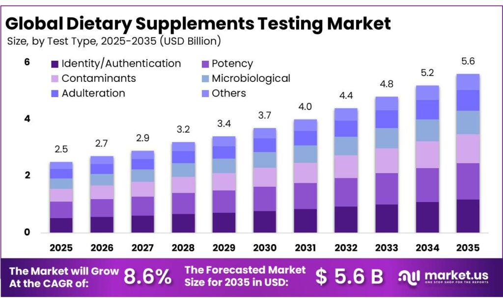 Global Dietary Supplements Testing Market Size, Share Analysis Report By Test Type (Identity/Authentication, Potency, Contaminants, Microbiological, Adulteration, Stability And Shelf Life, Allergen And GMO, Label Claim Verification, Functional Claims, Others), By Product Tested (Botanicals, Phytochemicals, Vitamins And Minerals, Amino Acids And Proteins, Specialty Supplements, Others), By Region and Companies - Industry Segment Outlook, Market Assessment, Competition Scenario, Trends and Forecast 2026-2035